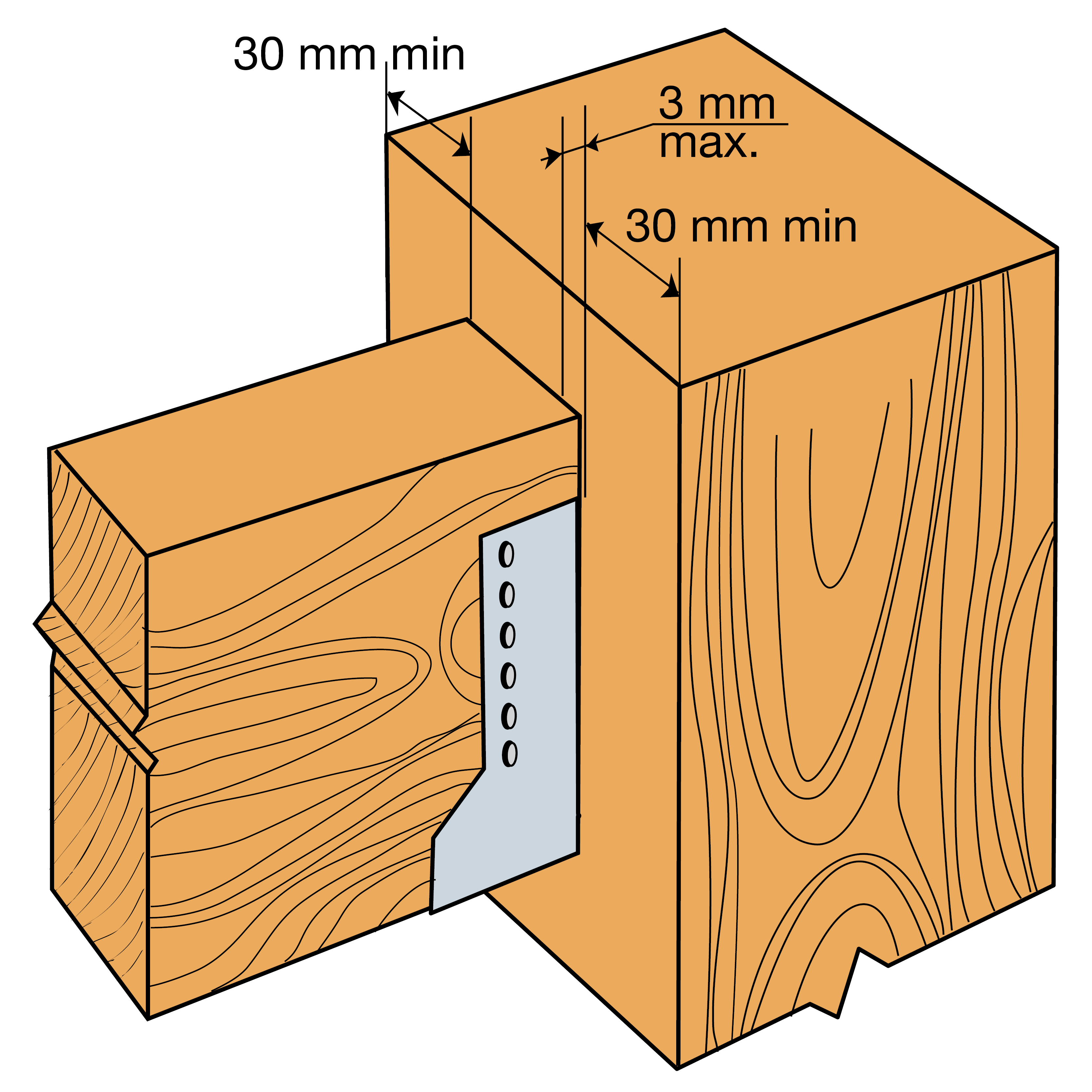Attention, pour les sabots SAI-SAIL à ailes intérieures de largeurs inférieures à 64 mm (SAI) et 80 mm (SAIL), les ailes sont recoupées sur la hauteur dans l’axe des perçages de boulons. La fixation sur le porteur est donc uniquement possible par pointes ou vis dans la ligne verticale de perçages Ø5 proche du pli.