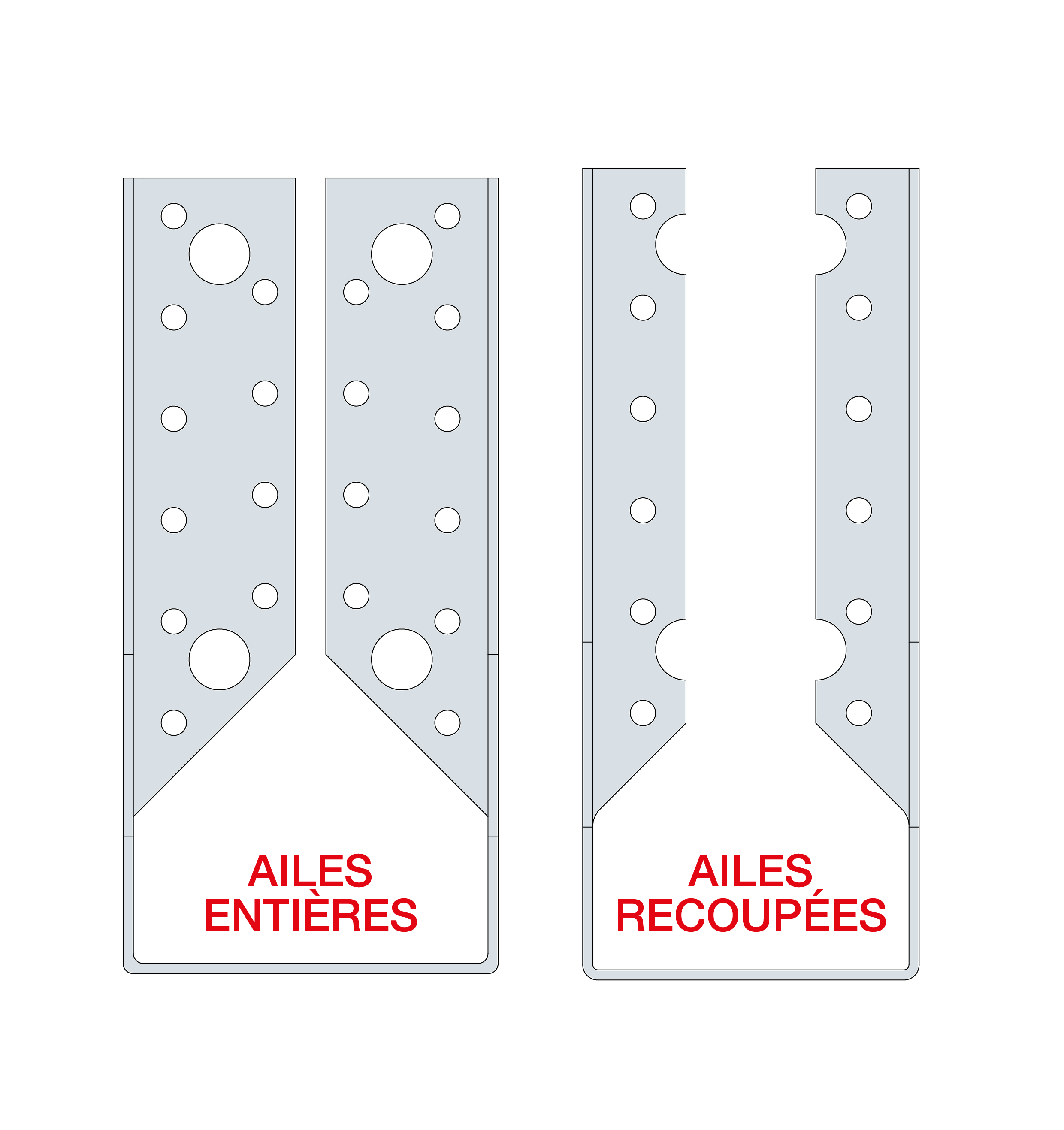 | Références | Développé [mm] | Avec perçages de pointes uniquement (ailes recoupées) | Avec perçages de tirefonds et pointes (ailes entières) |