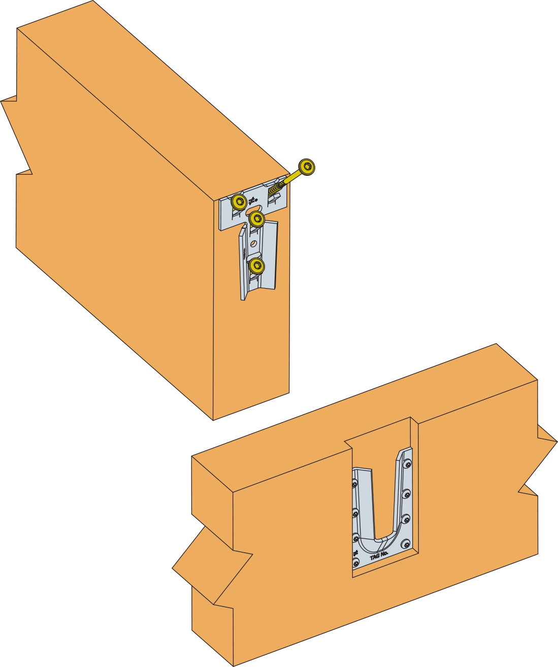 De stalen beugel met zwaluwstaart ETSN is een innovatieve en zeer discrete verbinder. Hij biedt de esthetisch verzorgde afwerking van een klassieke zwaluwstaartverbinding. Het mofeind wordt op de dragende balk geplaatst met schroeven CSA of nagels CNA, terwijl het spie-eind op de gedragen balk wordt bevestigd met de platkopschroeven SWW.